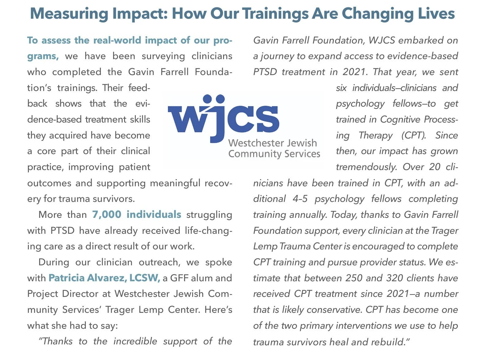 The Gavin Farrell Foundation has undertaken a research study of our implementation and dissemination of CPT training at NYU. Our findings show that, on average, clients who participated in CPT experienced a substantial alleviation in their PTSD symptoms, and their functioning in areas such as work and family relationships improved significantly. Most of the people who completed all 12 sessions reported PTSD symptom levels that fell below the symptom level that would suggest a PTSD diagnosis.