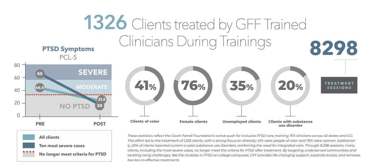 The Gavin Farrell Foundation’s mission is to improve the lives of the vast number of individuals with Post-Traumatic Stress Disorder (PTSD) by increasing access to highly effective forms of treatment and raising awareness about their efficacy. By providing training in evidence-based therapy to licensed clinicians and mental health agencies, we help hundreds of therapists better support and deliver the care they need for an enhanced quality of life.